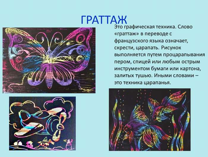 Граттаж — это метод выполнения рисунка с помощью процарапывания острым инструментом бумажного листа, покрытого фоном тёмного цвета. В результате получаются оригинальные контрастные композиции. Название данной техники происходит от французского слова (gratter), что в переводе обозначает «скрести, царапать». Она имеет ещё одно название — воскография. Техника выполнения доступна каждому, а процесс увлекает как взрослых, так и детей.